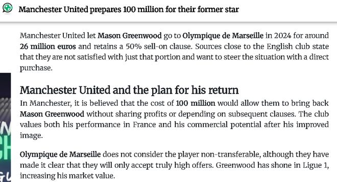 而且,考虑曼联对待青木的方式,他恐怕也不想回来。然而,格林伍德的经纪人可能通过曼联的传闻,来吸引其他豪门的关注。「曼联都后悔卖掉他」,是一个非常吸引人的宣传点。据称,他未来更有可能重返西甲,他曾被曼联租借到马德里的小球会和赫塔费。