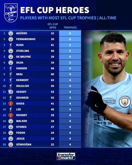 英联杯夺冠次数排名:阿圭罗费鸟6次居首,曼城诸将在列